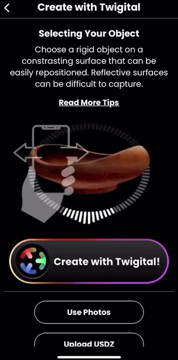 Available for iOS now! Simply scan your object utilizing the Twigital app and mint the resulting file to take the form of an NFT complete with certificate of creation and immutable timestamp all within the workflow of the application